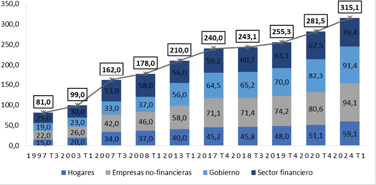 Gráfico 1. Deuda mundial por sector institucional, en billones de dólares (1997-2024)