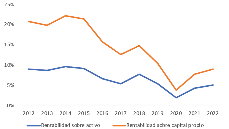 Como primera aproximación, los datos mostraron que, efectivamente, la crisis actual se refleja en un deterioro significativo en la rentabilidad del capital, que entre 2014 y 2022 cayó 44 % si se mide sobre el activo y 57 % si se lo hace sobre el capital propio invertido.