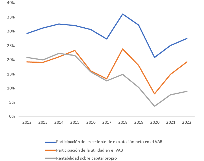 Gráfico 2. Evolución de la rentabilidad sobre el capital propio y de la participación del Excedente de Explotación Neto y de las Utilidades en el Valor Agregado según la ENGE. Argentina (2012-2022)