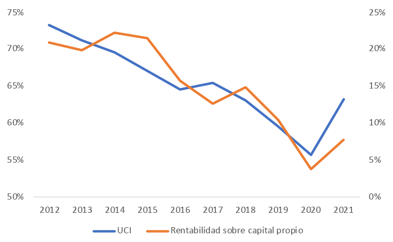 Gráfico 3. Evolución de la rentabilidad sobre el capital propio y de la Utilización de la Capacidad Instalada en la Industria (UCI). Argentina (2012-2022)