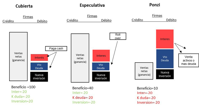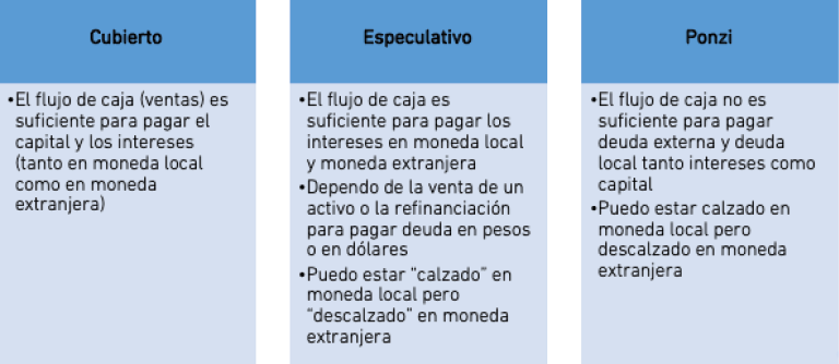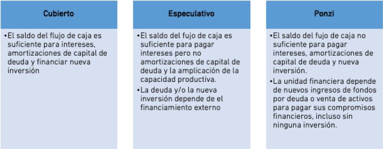 Para dar cuenta de estas relaciones interdependientes, Minsky utilizó 3 categorías en donde las unidades económicas tendrían o no una situación de sustentabilidad o insustentabilidad financiera. Estas se resumen en el esquema 1 a continuación.