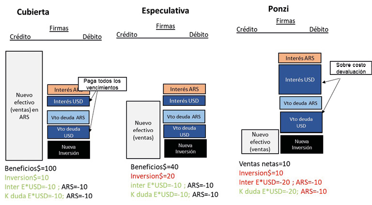 En el esquema 5 a continuación se presenta una adaptación a este esquema desde la perspectiva de la firma. En primer lugar, en la situación cubierta los pagos pueden realizarse de manera equivalente a lo que sucede en una economía cerrada. En segundo lugar, en la situación especulativa la refinanciación dependerá del resultado de la tasa de interés local más las condiciones de acceso a las divisas para pagar la deuda denominada en moneda extranjera. Si existe tanto los recursos para pagar los intereses y la capacidad de acceder a la refinanciación, la situación de la firma es especulativa. En tercer lugar, la deuda es insostenible y se está deteriorando el patrimonio neto con tal de pagar intereses, ingresando en una trayectoria explosiva.