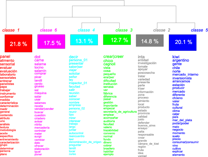 Observando la representación de las clases basada en el porcentaje de palabras (Figura 1), la clase 1 se destacó con la mayor incidencia, abarcando aproximadamente el 21,8% del corpus analizado. Luego, la clase 5 contribuyó con el 20,1%, la clase 6 con el 17,5%, la clase 2 con el 14,8%, la clase 4 con el 13,1% y la clase 3 con el 12,7%. Este análisis revela que la clase 1, con la mayor representación, está relacionada con una actividad realizada por el INTA, la análisis sensorial y caracterización de productos, y se diferencia de las demás clases. La clase 2 también se alinea con actividades del INTA, especialmente relacionadas con el contexto del kiwi, ya que se acerca a la clase 5, resaltando la importancia del panel sensorial para la institución en investigaciones que permiten la diferenciación de productos. En cambio, las clases 3, 4 y 6 están vinculadas al contexto del salame de Tandil. La clase 3 aborda los desafíos en el reconocimiento de la DOT (Denominación de Origen Tandil), la clase 4 representa el carácter motivacional detrás del proyecto de la DOT y la clase 6 discute los procedimientos de elaboración del salame de Tandil.