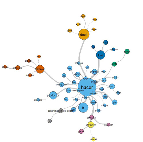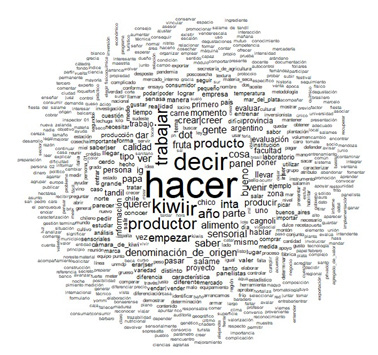 “Decir”, “trabajar” e “kiwi” establecen una relación fuerte con “hacer” y, a su vez, presentan nuevas ramificaciones. En “trabajar”, destacan las palabras “proyecto” y “alimento”, seguido de “evaluar”, apuntando a la importancia del trabajo de evaluación de alimentos, especialmente el proyecto que involucra la investigación con papas. En “decir”, las palabras “Tandil” revelan una relación de este grupo con la producción de salame, donde hubo una aproximación con fábricas de gran tamaño como Cagnoli y empresas más pequeñas (“chico”). Y en “kiwi”, su ramificación con “argentino” está relacionada con la necesidad de reconocimiento de la producción de la fruta en el mercado nacional.