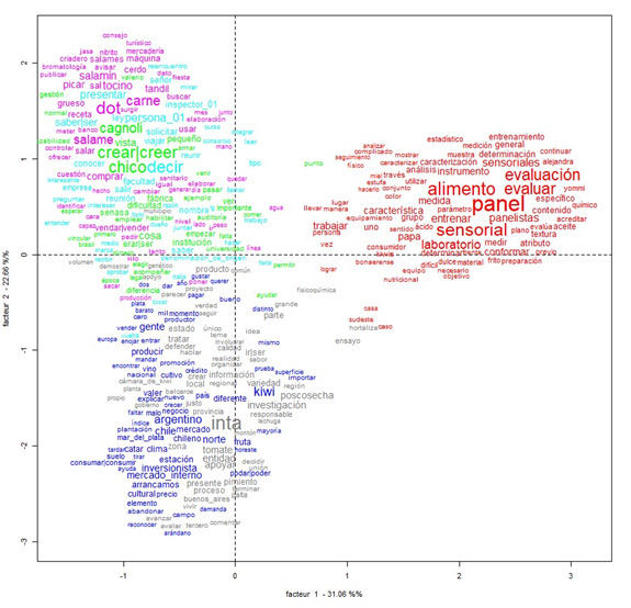 A continuación, se realizó el Análisis Factorial de Correspondencia (AFC), en el que las palabras, considerando su incidencia de frecuencia en las clases, se representaron en un plano cartesiano, como se muestra en la Figura 2.