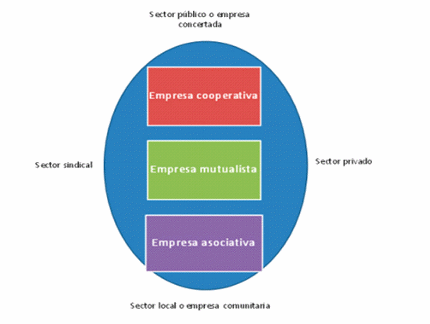 Monzón y Chávez (España), Desroche (Quebec) y Vienney (Francia) han realizado aportes para el estudio de este sector. Uno de ellos es la identificación de 4 interfases del mismo con otros sectores o actores, con la finalidad de obtener una visión más dinámica de la economía social. H. Desroche (1983) sugiere imaginar, según el esquema que en esta página se recoge, cuatro interfases de conexión con otros sectores alrededor del núcleo central formado por los principales componentes. Una primer interfase pone en contacto la economía social con el sector público mediante la empresa cooperativa, mutualista o asociativa concertada con servicios públicos, con la condición de que este concierto permita una autonomía de gestión. En este sentido podemos referirnos a una parte del sector hospitalario, concretamente a los centros dirigidos por asociaciones privadas en el marco de normas y criterios presupuestarios asignados por los poderes públicos. En Argentina no tenemos este tipo de “empresa concertada” pero lo que sí tenemos son por ejemplo las cooperadoras escolares u hospitalarias que desarrollan una serie de servicios complementarios del servicio público de educación o salud, empleando para ello fondos que provienen del Estado y de la comunidad. Existe otra interfase, próxima a la anterior, entre la economía social y el sector municipal o colectivo si la gestión de ciertas actividades municipales se lleva a cabo en cooperación con una asociación local o una comunidad barrial.