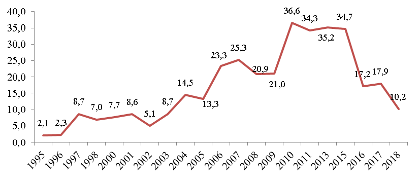 Fuente: elaboración propia a partir del Latinobarómetro (1995-2018). Variable: “Principal problema del país”.