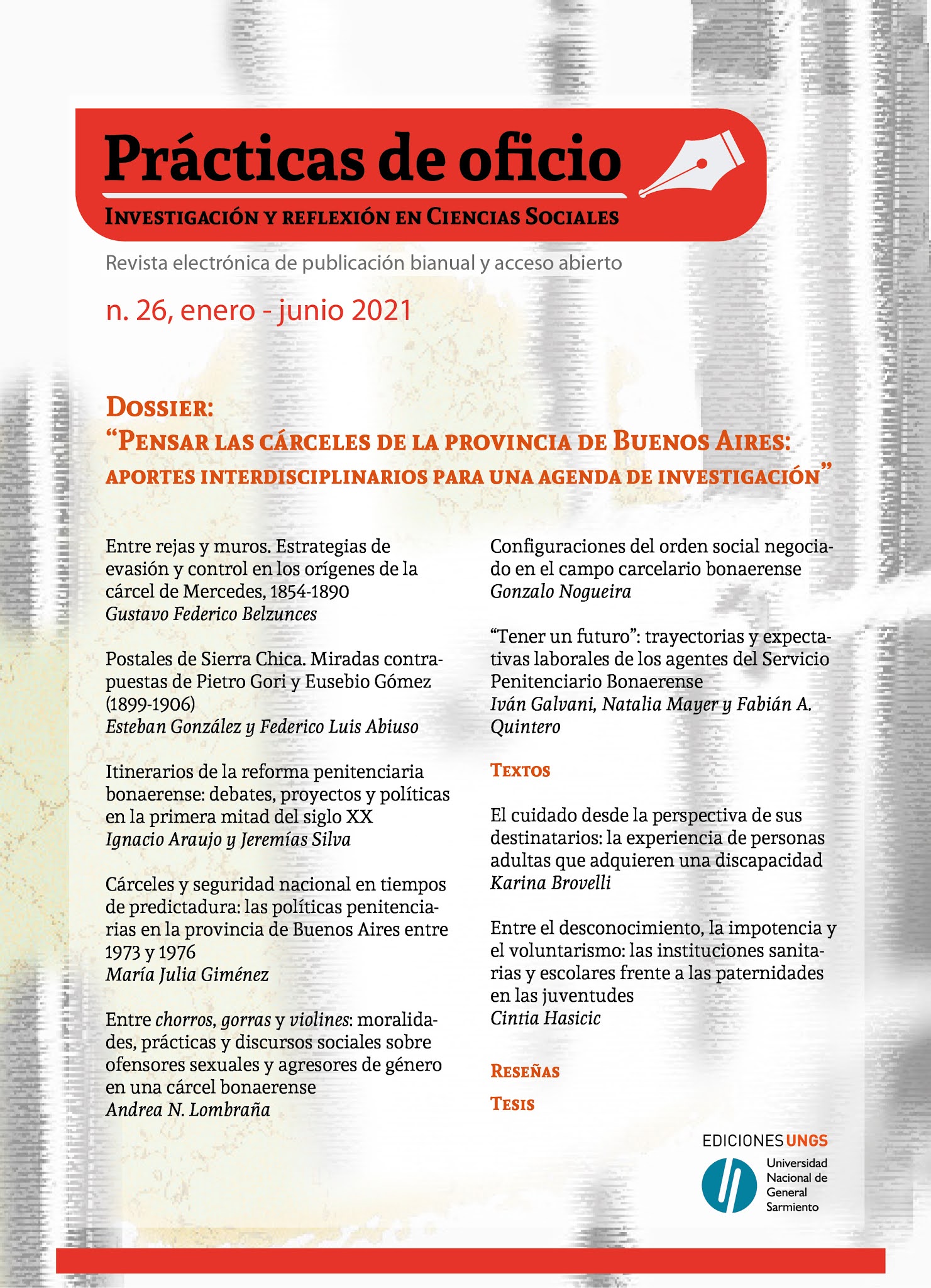 Yangilevich, M. (2017). “Vínculos complejos: cárceles, Estado y sociedad en la provincia de Buenos Aires (Argentina) durante la segunda mitad del siglo XIX”. Claves. Revista de Historia, 3(4): 165-190.